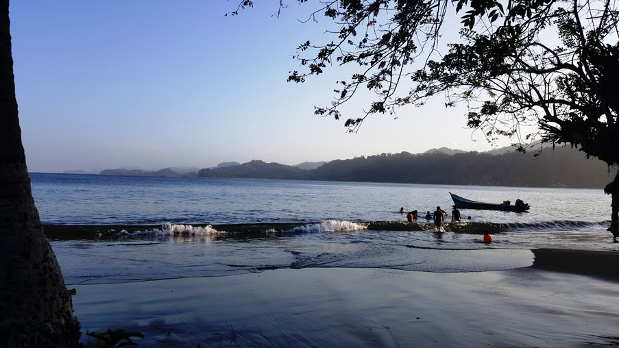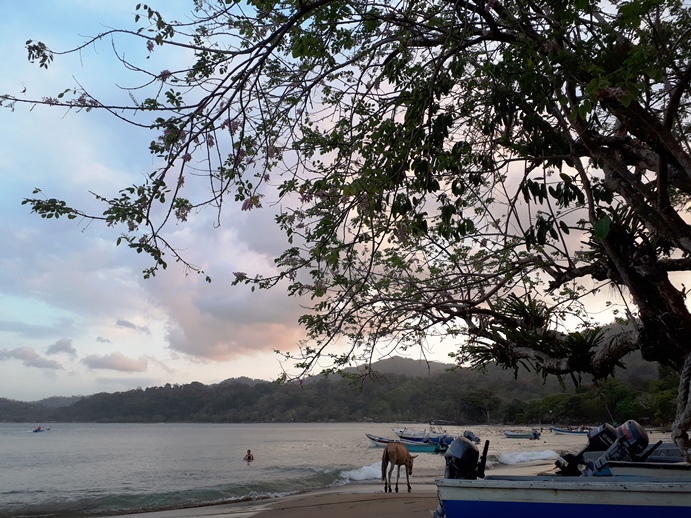 Située au bord de la mer des caraïbes près de la frontière entre la Colombie et le Panama, la baie de Trigana est aussi une porte d’entrée à la forêt vierge du Darien, d’une densité telle qu’elle est toujours la frontière naturelle quasi infranchissable qui sépare toujours les deux Amériques, on ne peut toujours pas rejoindre l’Alaska à la Patagonie andine uniquement à cause de cette zone et sûrement d’une volonté des Etats-Unis mais c’est aussi bien pour tout le monde… Et surtout pour la nature ! Petits villages de pêcheurs et d’agriculteurs, pas de route, des chemins, pas de voitures, des mules, des chevaux et des vélos, pas de vaches, des zébus, pas de bus, des bateaux… La jungle, remplie d’animaux, singes hurleurs, capucins, paresseux, courageuses fourmis, fourmiliers, petites grenouillettes colorées mais intouchables, gros serpents venimeux, caïmans, koatis, toucans, perroquets et divers oiseaux de toutes les couleurs, elle déboule de la montagne et vient se jeter dans la mer, cette mer cristalline couleur émeraude remplie de poissons colorés malgré l’absence de coraux, qui ronge la plage, abat les arbres à pain, charrie des bois flottés aux formes psychédéliques et accueille de nombreuses tortues vertes qui paissent les fonds de la baie, riches en algues dont elles se nourrissent.